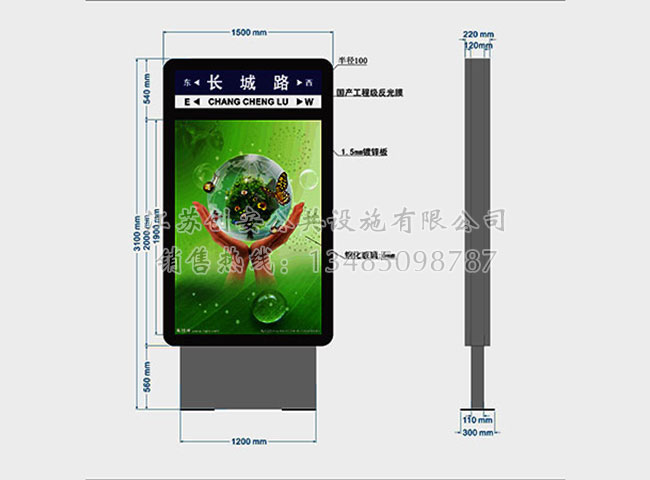 此款路名牌燈箱LMPDX-42主體采用鍍鋅鋼結構,表面采用氟碳金屬烤漆工藝,視窗面板采用鋼化玻璃,燈箱內置LED燈。具有外形美觀、表面耐腐蝕、抗風性能強、使用壽命長等優點。產品的樣式、尺寸、顏色、材質、配置等均可按需定制。