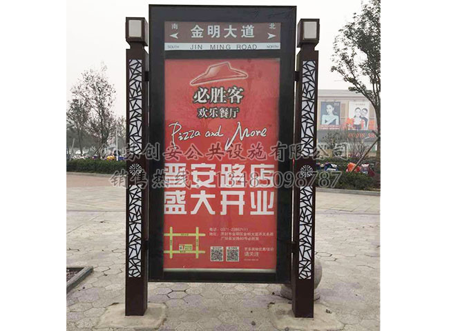 此款路名牌燈箱LMPDX-28采用鍍鋅鋼結構,表面采用氟碳金屬烤漆工藝,視窗面板采用鋼化玻璃,燈箱內置LED燈。具有外形美觀、表面耐腐蝕、抗風性能強、使用壽命長等優點。產品的樣式、尺寸、顏色、材質、配置等均可按需定制。